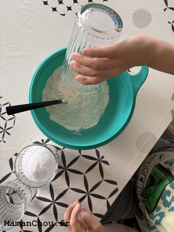- On commence par préparer la pâte à sel : deux verres de farine, un verre de sel fin et enfin un verre d’eau tiède. On mélange bien, si la pâte est trop liquide, on ajoute de la farine, si au contraire, elle est trop friable, on ajoute un peu d’eau.