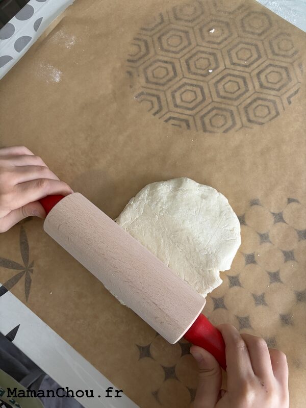 - A l’aide d’un petit rouleau à pâtisserie on étale la pâte.