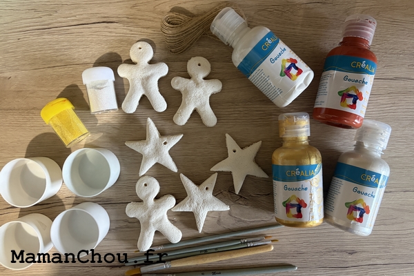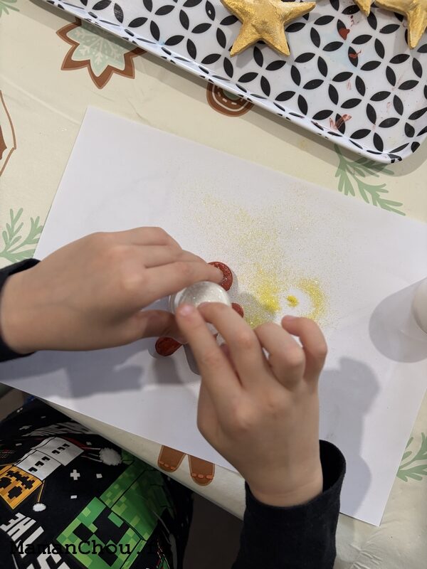 - Enfin, quand la peinture est sèche, on applique la colle liquide à l’aide d’un pinceau et on fait briller tout ça avec des paillettes. Après séchage, j’ai ajouté de la ficelle pour pouvoir suspendre les bonhommes au sapin.