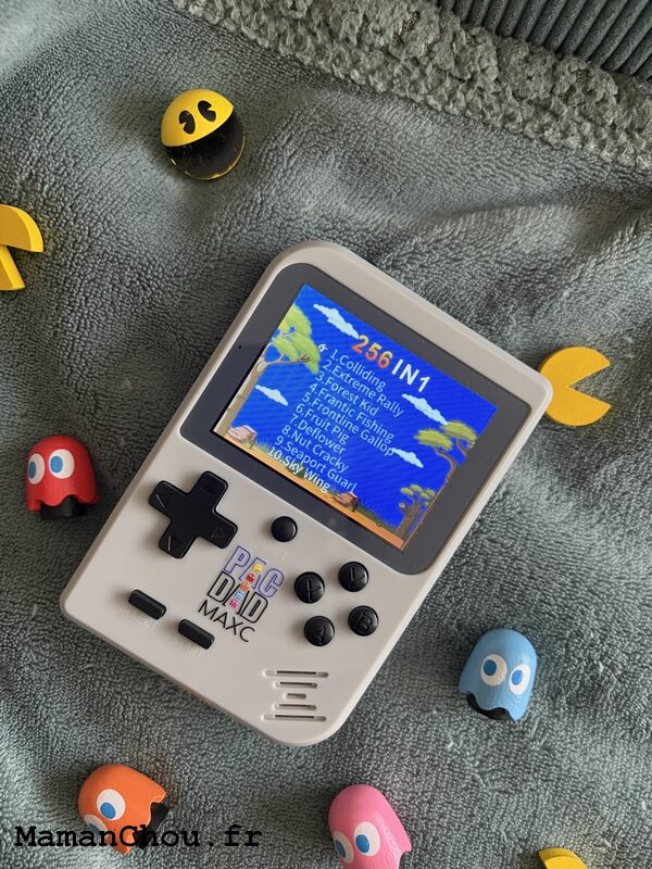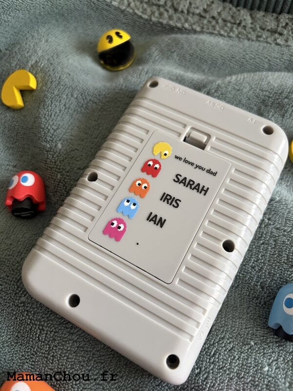 Mon idée suivante est un cadeau nostalgique : une console portable rétro que tu peux personnaliser. Logo, photo, nom… Bref, tout est possible ! Pour Papa Chou, j’ai opté pour la version 256 jeux et personnalisée avec un design PAC-MAN.