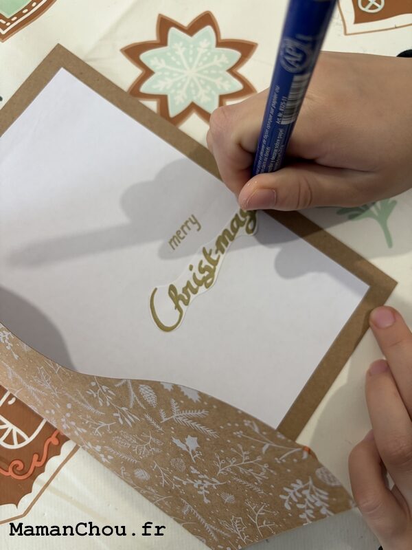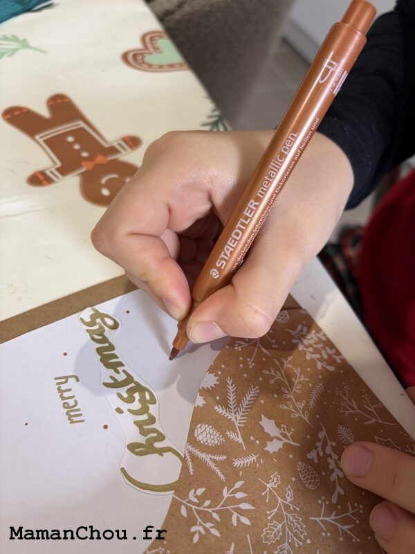 - A l’aide des feutres metallic de Staedtler, pen et calligraphy, Ninie est venue inscrire un très joli « Merry Christmas ».