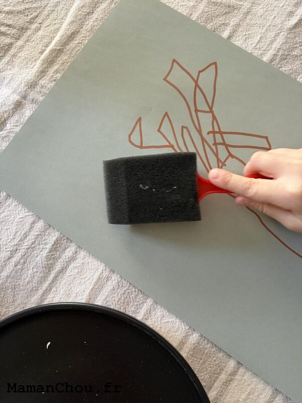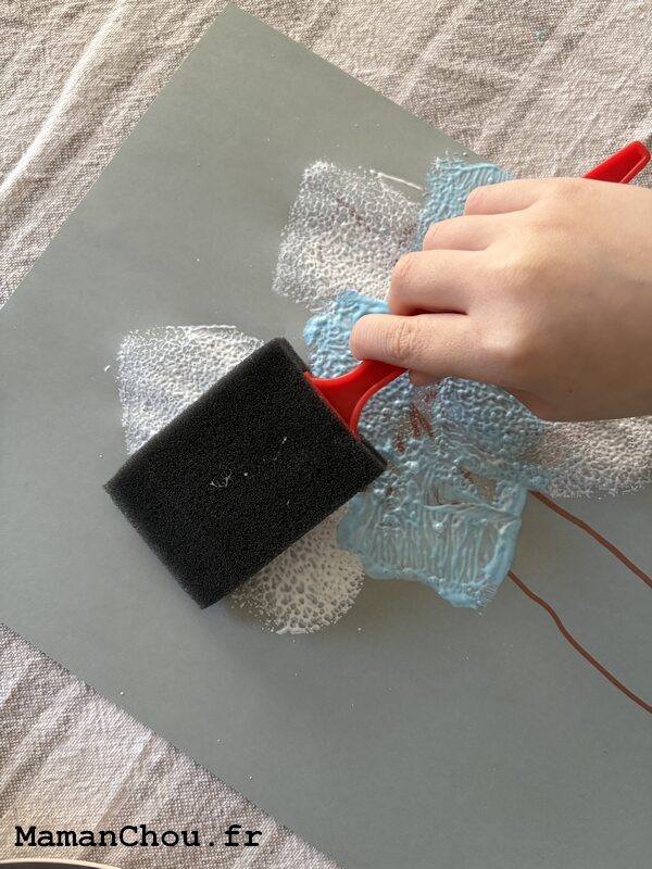 - On dispose de la peinture blanche dans l’assiette. On vient poser le pinceau mousse doucement dedans puis on applique la peinture sur notre arbre en appuyant légèrement plusieurs fois à différents endroits de la feuille.
