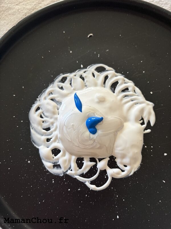 - On ajoute un peu de peinture bleue dans la peinture blanche et on mélange.