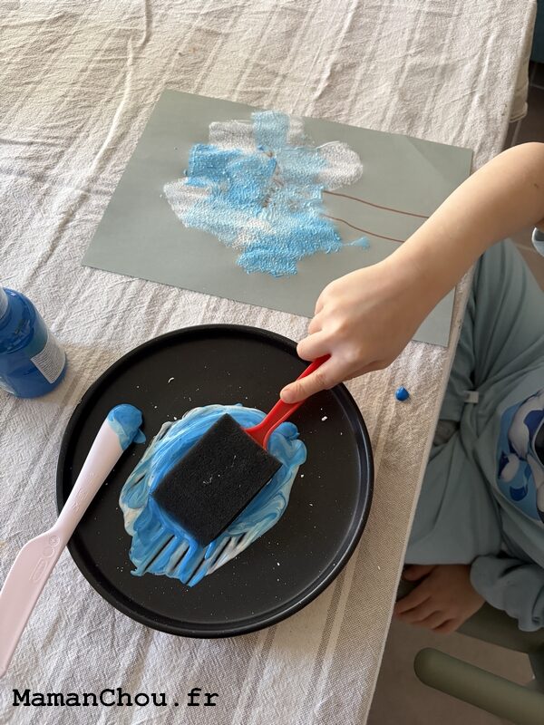 - On renouvelle les étapes encore une fois en ajoutant à nouveau de la peinture bleue dans notre mélange. On termine en appliquant la peinture sur notre feuille. On laisse ensuite bien sécher.