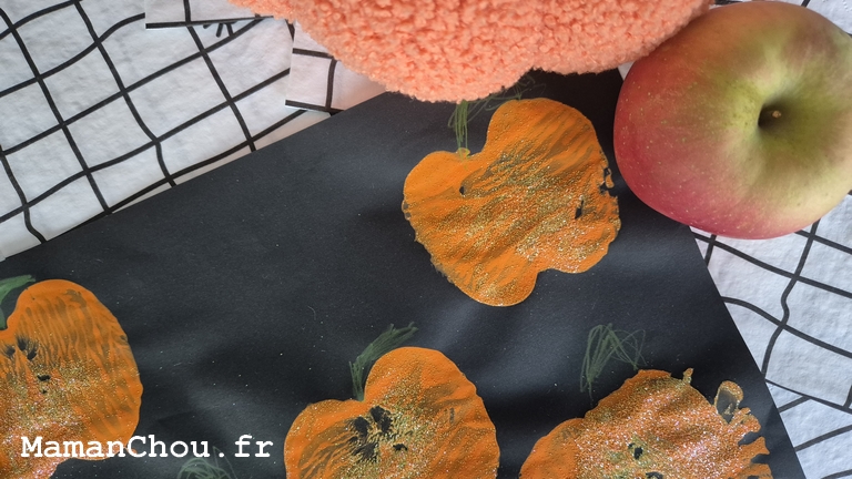 - On commence par couper une pomme en deux. On utilise une demi pomme pour faire des empreintes sur la feuille noire.