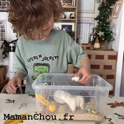 Il adore son nouveau bac sensoriel.
