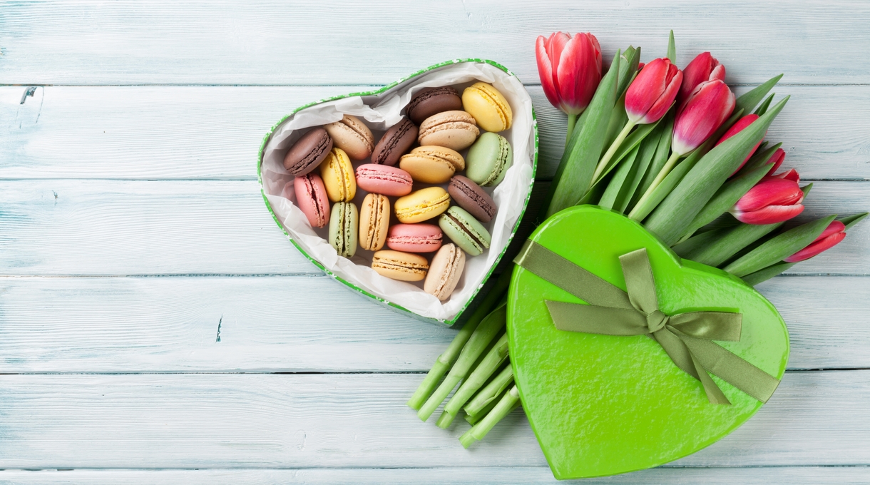 Red,Tulips,Bouquet,And,Gift,Box,With,Macaroons,On,Wooden
